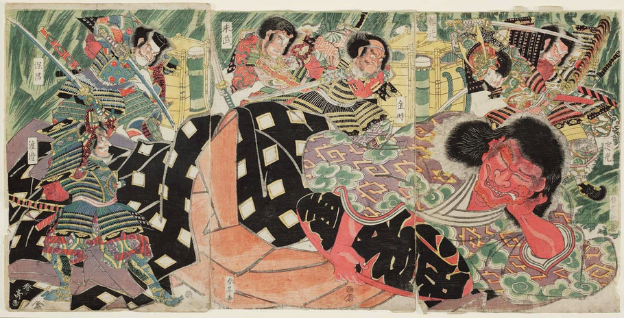 Seizing the moment, Raikō and his men shed their monk robes, donned armor, and prepared for battle. The three divine elders appeared once again, binding the demon’s limbs with invisible cords and commanding Raikō to strike.