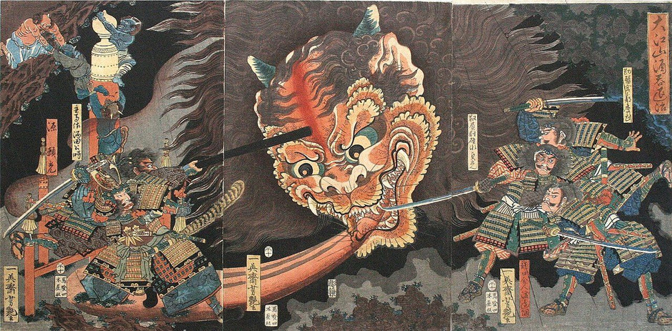 Possessing the power to shapeshift, Shuten-dōji often appeared as a handsome man, descending from his mountain lair to kidnap the sons and daughters of Kyoto’s nobles. In his fortress, the demon and his monstrous followers feasted on their victims.