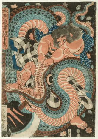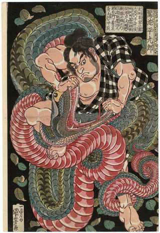 One recurring motif in Edo‑period storytelling and woodblock prints is the image of a group of heroic warriors battling a daija. Often associated with the legendary Four Heavenly Kings (Shitennō) - elite samurai who served famous generals like Minamoto no Raikō or Minamoto no Yoshinaka - these stories portray the warriors facing monstrous snakes in remote mountain passes or sacred waters.